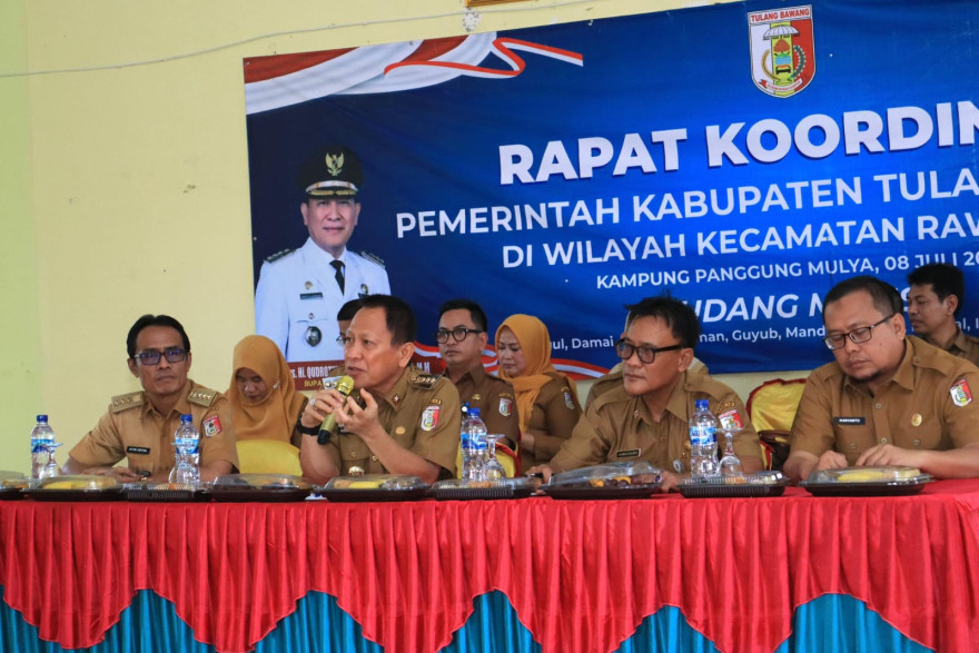 Rawa Pitu, 8 Juli 2025 - Dalam upaya meningkatkan sinergitas dan optimalisasi pelaksanaan tugas-tugas pemerintahan, Kecamatan Rawa Pitu menggelar Rapat Koordinasi yang dihadiri langsung oleh Bupati Tulang Bawang K.R.A.T Drs. Qudrotul Ikhwan Karyonagoro, M.M. dan Asisten 1, Kadis pendidikan, Kadis PU, Kadis Koperasi, Kadis dukcapil, Kominfo, Dinas PMK/K, serta beberapa Organisasi Perangkat Daerah (OPD) terkait. Acara yang berlangsung di Balai Kampung Panggung Mulya, Kecamatan Rawa Pitu ini dimulai pukul 08.00 WIB hingga selesai.
